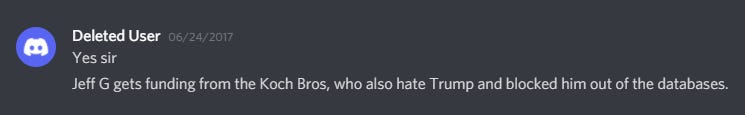 This was related to Brower’s reasoning for giving them to me. Another reason Brower disclosed was that U.S. President Donald Trump had been barred from “databases” by the Koch Brothers.