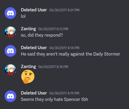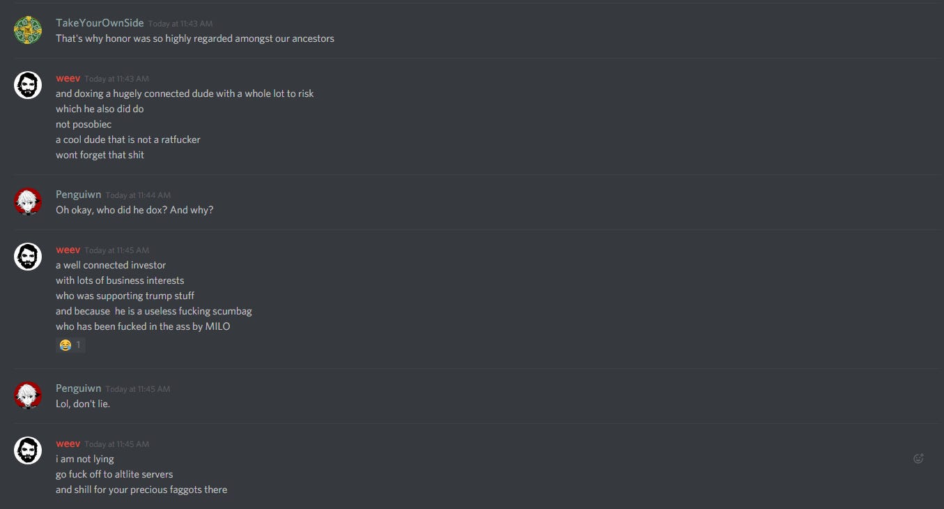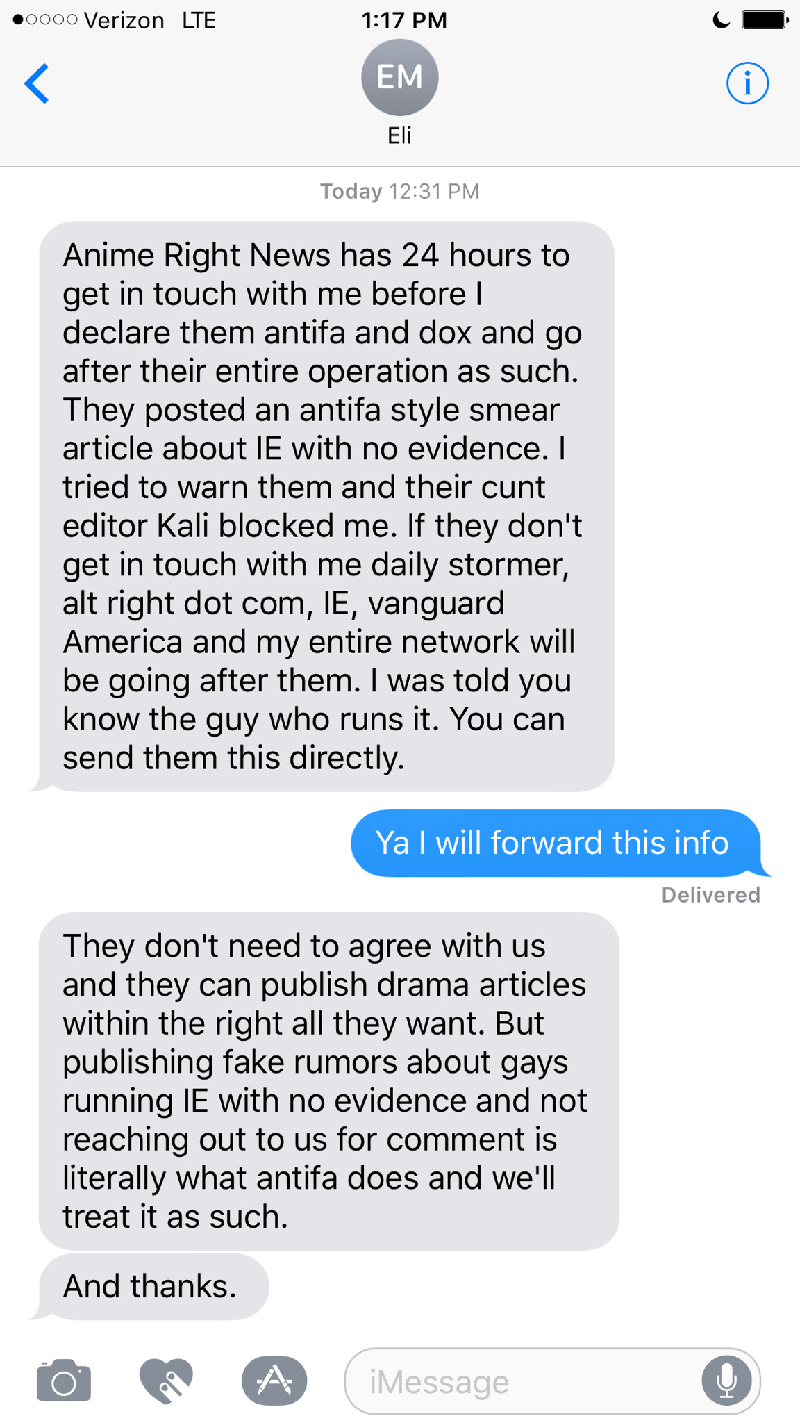 Anime Right News was a hub for gossip and information on leadership beyond its low profile. Apart from my own subversive activities, it had also received threats of doxing leading up to Unite The Right in 2017 from Elliot “Eli Mosley” Kline, due to stories covering Identity Evropa. Unflattering stories.